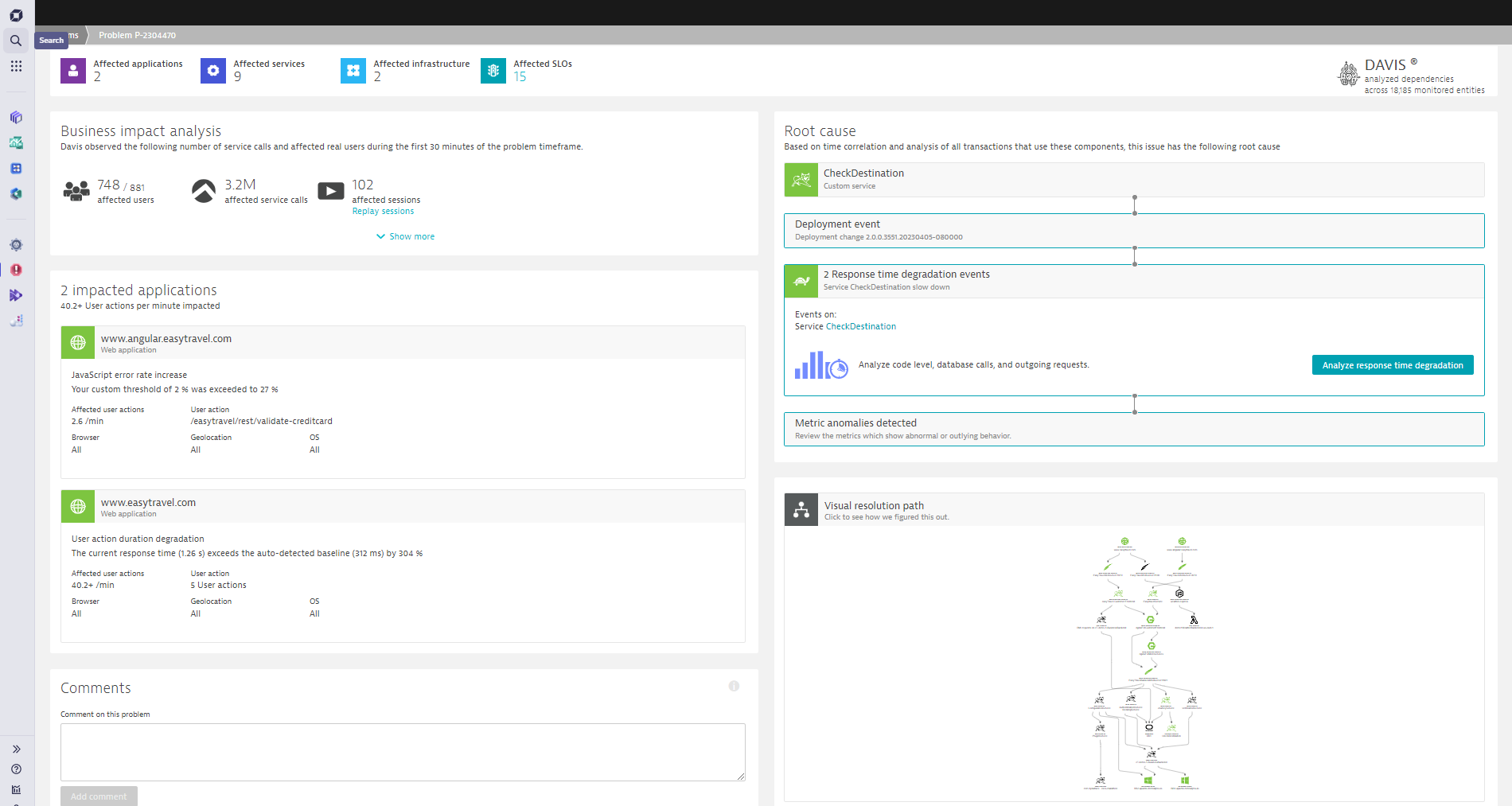 Con Dynatrace, puedes monitorear de forma continua y automática todos los componentes críticos de tu infraestructura híbrida y multicloud: servidores, contenedores, redes y más. Gracias a su inteligencia artificial Davis®, Dynatrace detecta, analiza y prioriza automáticamente cualquier anomalía, brindándote información precisa para resolver problemas antes de que impacten tu negocio.